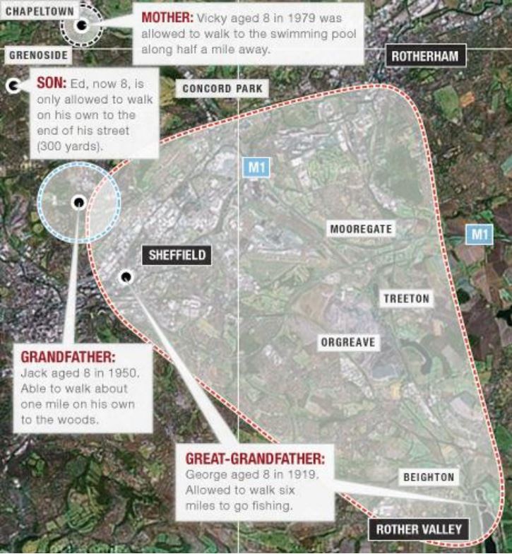 I shared the anecdote of 8-year-old Ed in Northern England: today he is only allowed to walk on his own to the end of the street. However when his mother was the same age in 1979, she was allowed to walk alone to the swimming pool half a mile away. Back in 1950, Ed’s grandfather was permitted to walk by himself about one mile to get to the woods. And in 1919, Ed’s great grandfather’s parents had no problem with him trekking six miles alone to go fishing.