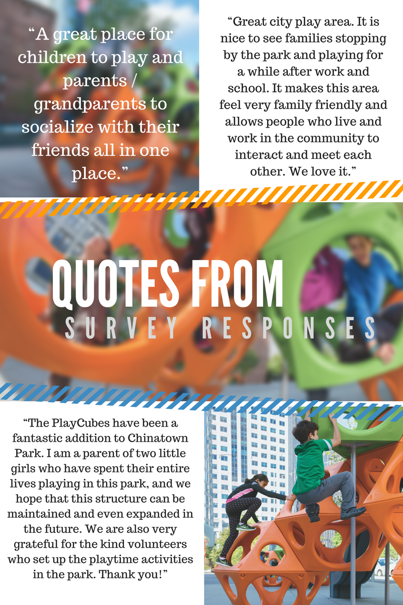 The Greenway Conservancy worked to determine interest in the PlayCubes staying in the park and discovered a passion had developed for the play equipment. Survey results revealed a strong desire for the PlayCubes to remain on The Greenway in Chinatown Park beyond their slated October 2016 removal. Based on user feedback and operational considerations, the Conservancy opted to extend the installation of the two largest PlayCubes systems.