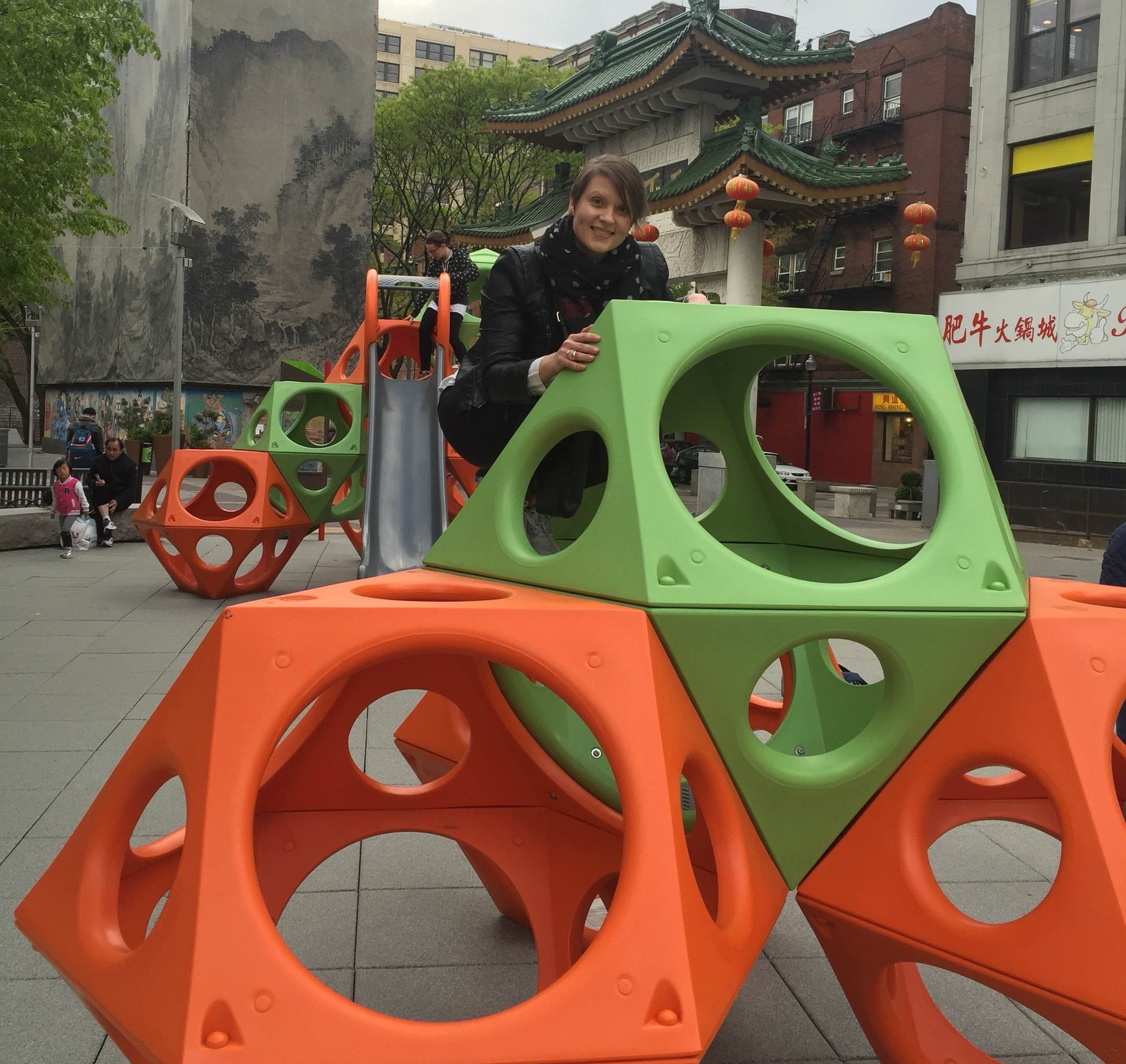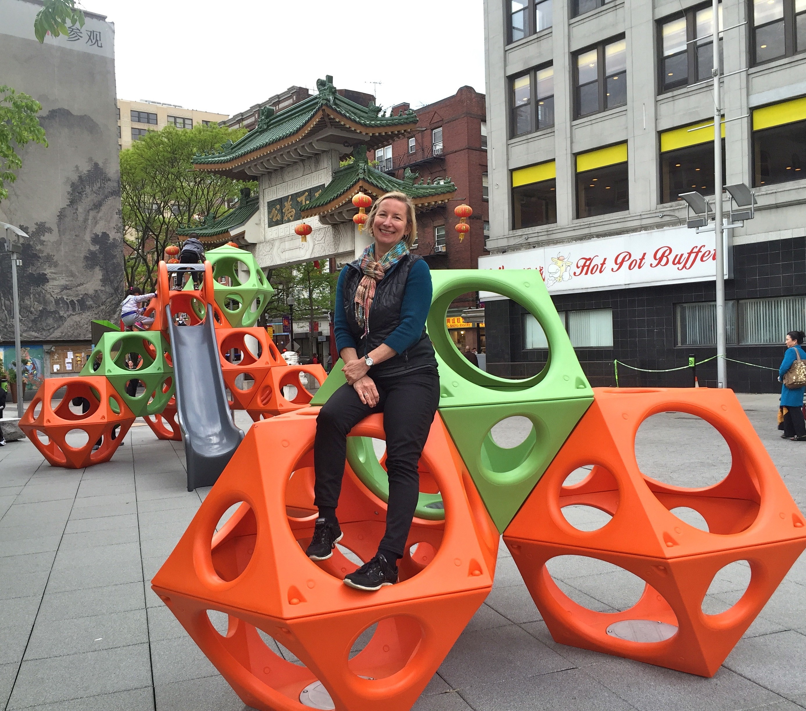 “We are bringing together families from neighborhoods whose children now have an opportunity to play together. It is truly wonderful to see a sense of community and how The Greenway inspires us once again! The PlayCubes Chinatown Plaza play area is especially significant for bringing together children from the Chinatown neighborhood and the Leather District neighborhood. I spoke to many grateful families playing here in Chinatown Plaza who are happy that their kids are now meeting and are experiencing joy together as they climb and slide together.” – Missy Benson, play advocate, Playworld