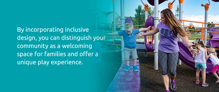 By incorporating an inclusive design, you can distinguish your community as a welcoming space for families and offer a unique play experience. Inclusive parks can be a potentially major draw for residents and visitors alike.