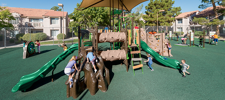 Community directors at the Crystal Cove Apartments in Las Vegas decided to set the complex apart by upgrading its outdoor space. One decision included installing a large play space over the existing tennis courts.