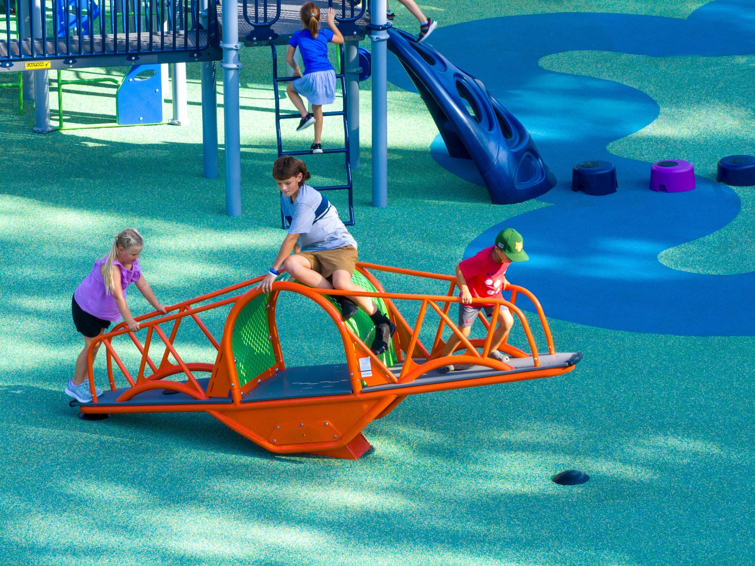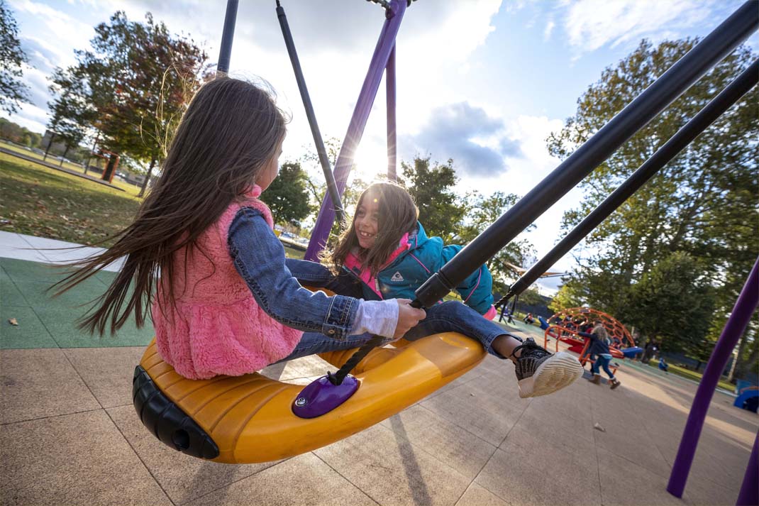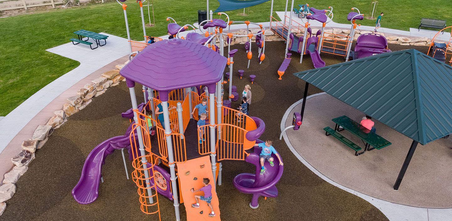 It’s hard to top the majesty of the mountain ranges in the distance, but this orange and majestic purple play space provides a striking contrast. Best of all, it’s full of activities for kids of all abilities. Double-wide ramps that can be accessed straight from the berm wall and sidewalk invite wheelchair users to roll right into the coolest play features. One such feature is AeroGlider™, a collaborative rocking motion experience kids (and even adults) love.