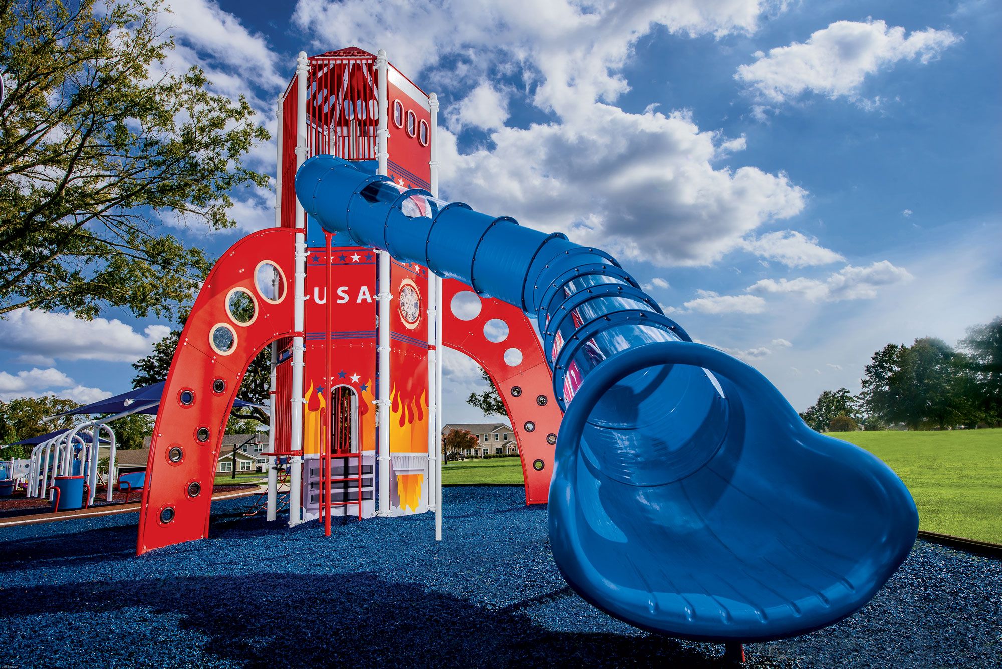 This playground is located on the Joint Base Charleston Air Base next to the community center, so it needed to be a welcoming space where all the families on base could connect. Playworld designed an aeronautical-themed play space full of custom features. The main rocket-like play structure for kids ages 5-12 features graphic panels with flames and American flare, fins you can climb on, a 15-foot spiral slide, and a 13-foot tube slide. The tall tower sparks imaginative play as kids climb up and blast off on a sliding adventure.