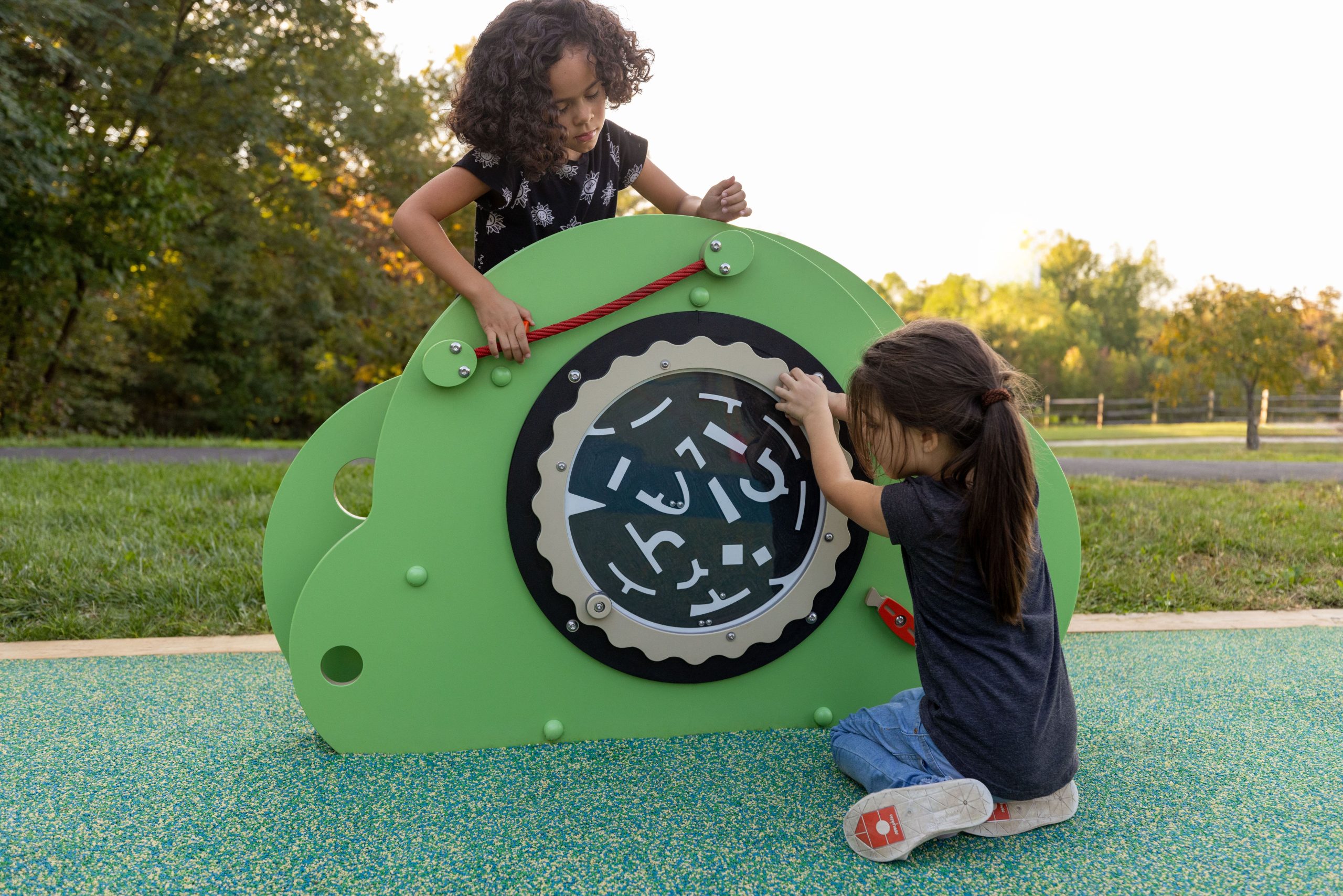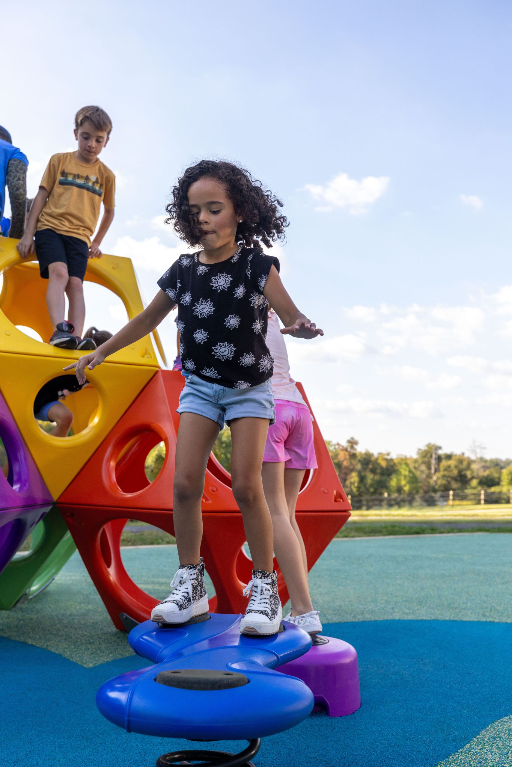 The rainbow motif continues throughout the space in the form of a multi-colored PlayCubes® structure, a striking orange and green Unity® Teeter Tunnel®, and blue and purple Unity® Steppers. Pops of color can also be found at the PlayTown™ Garden Sensory Walls, where kids can engage with thought-provoking inserts, and at the swings, where kids can enjoy a unique vestibular experience together via Hoopla Swing.