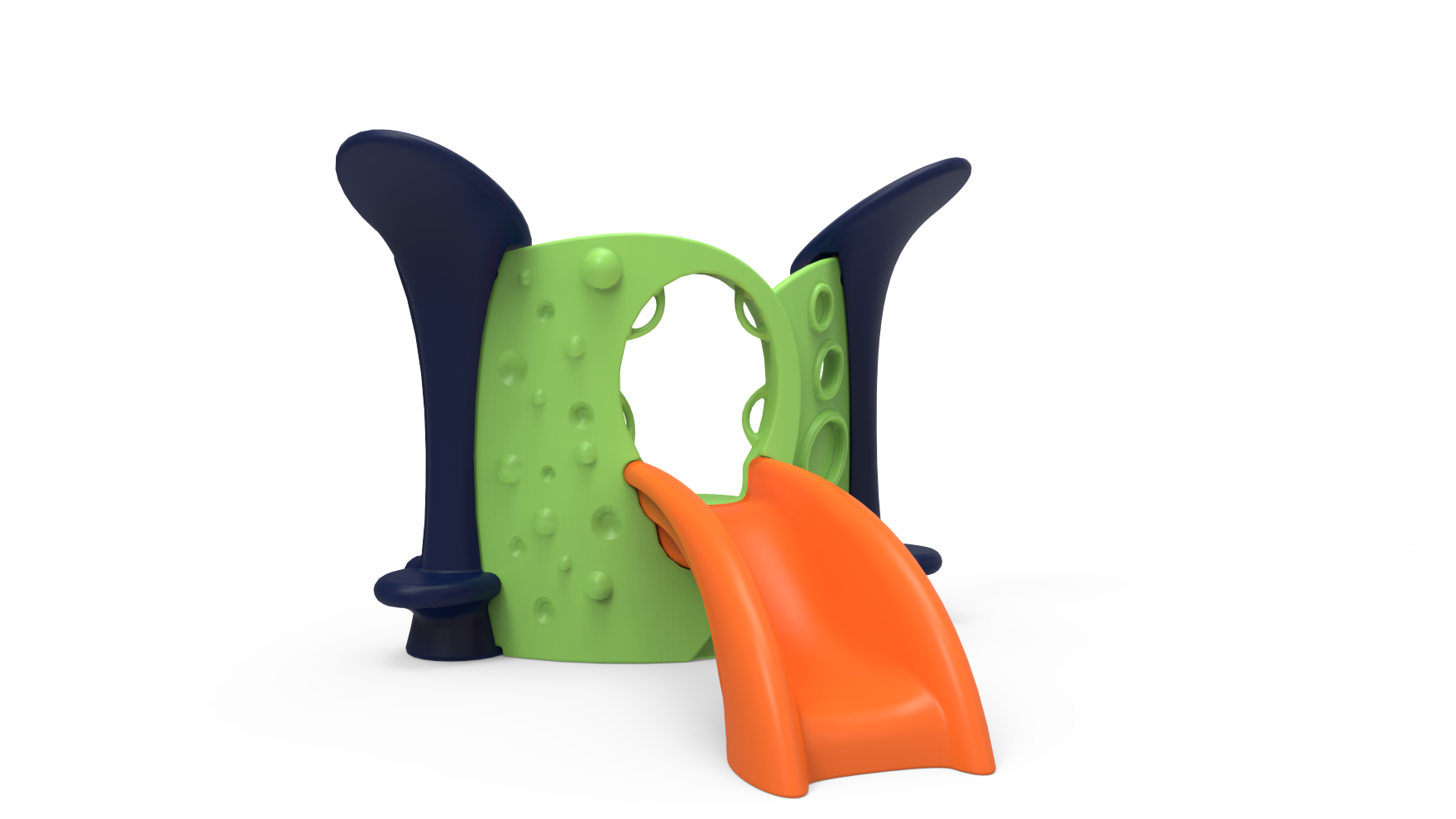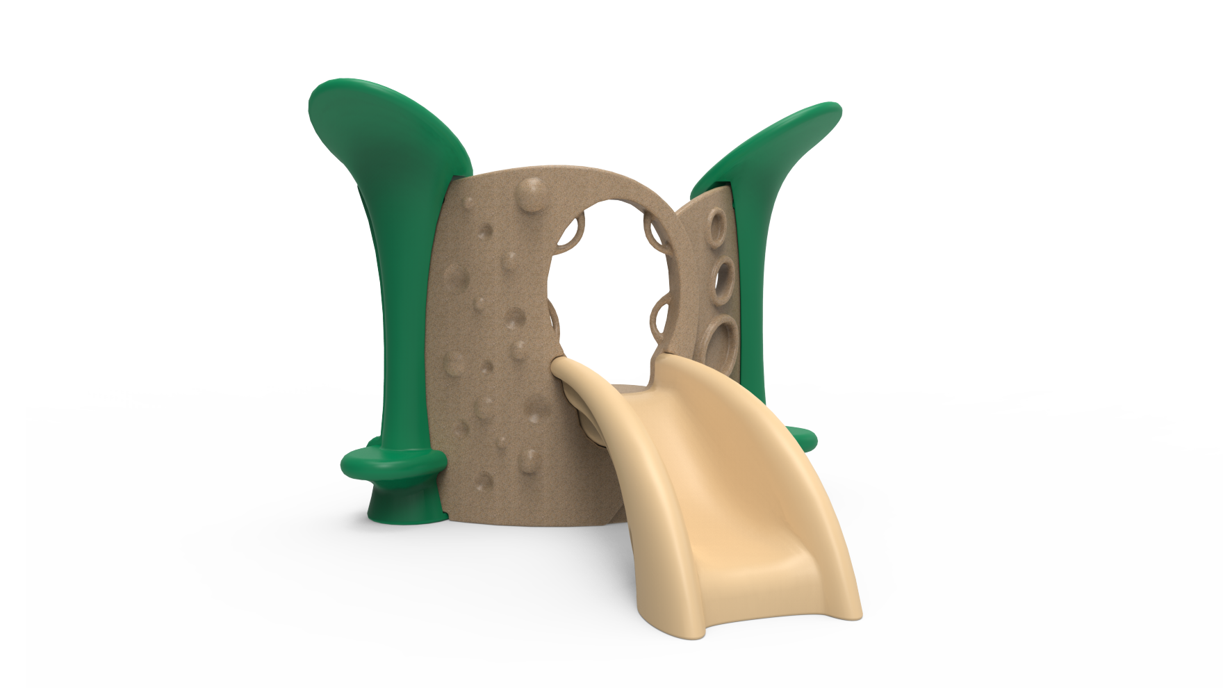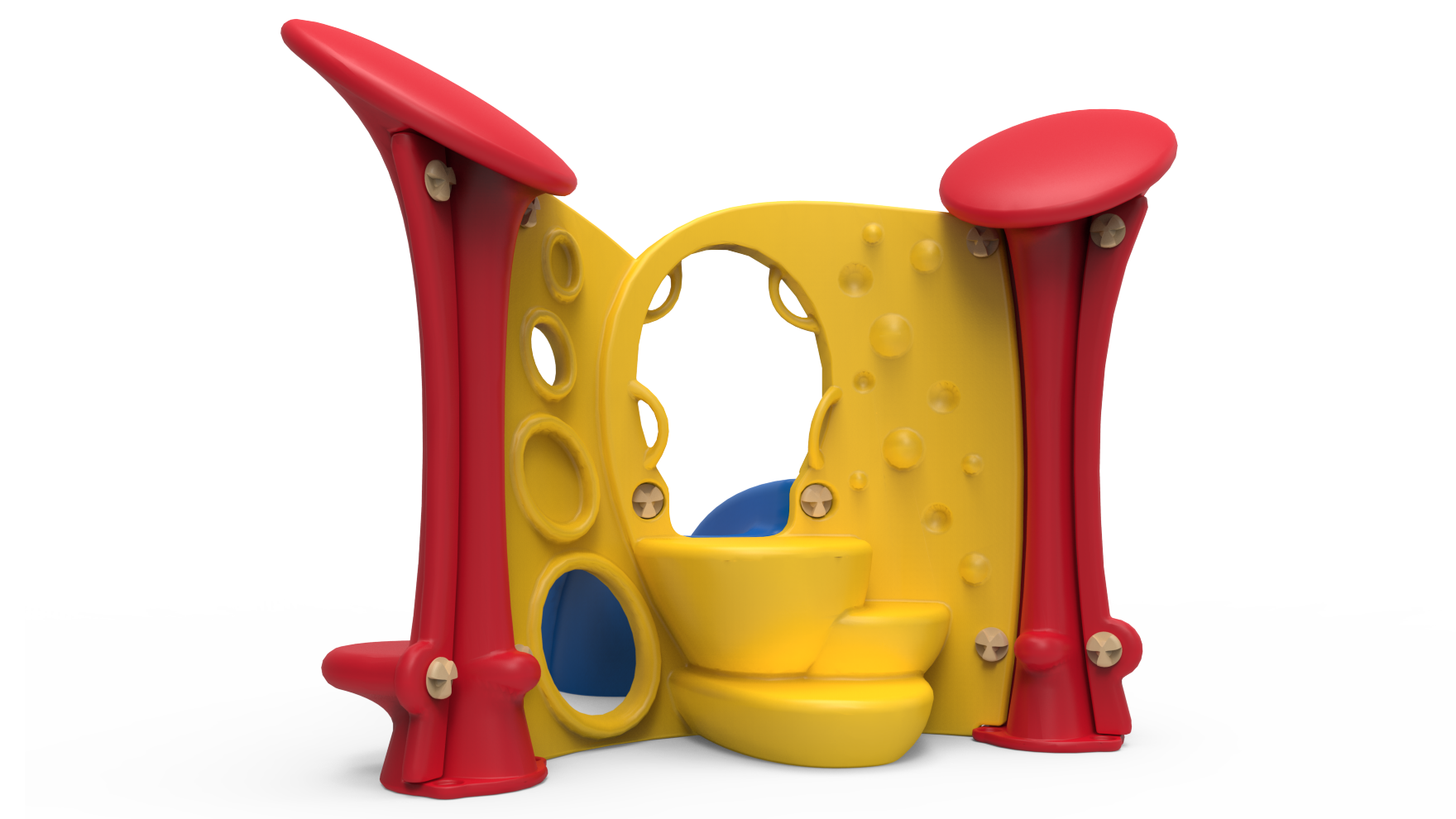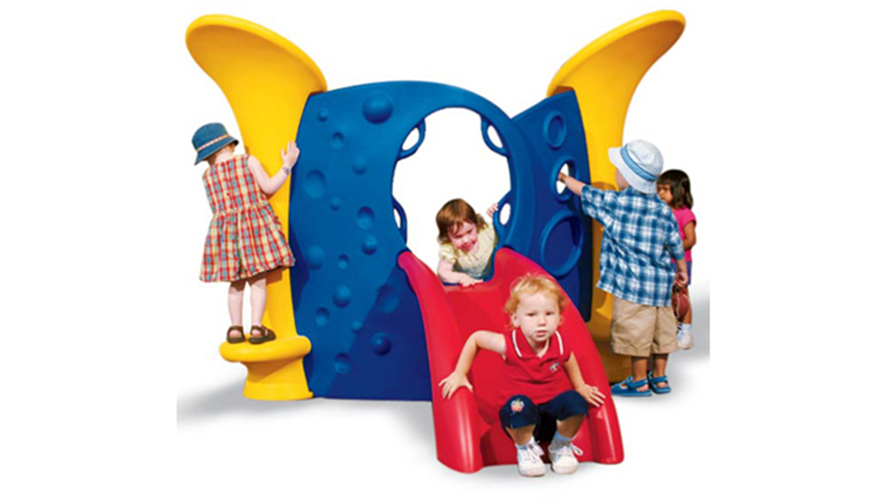 This playground is made of durable plastic, it's easy to clean and perfect for indoor or outdoor use. Design #1 can be mounted on an appropriate surface or installed in-ground."
