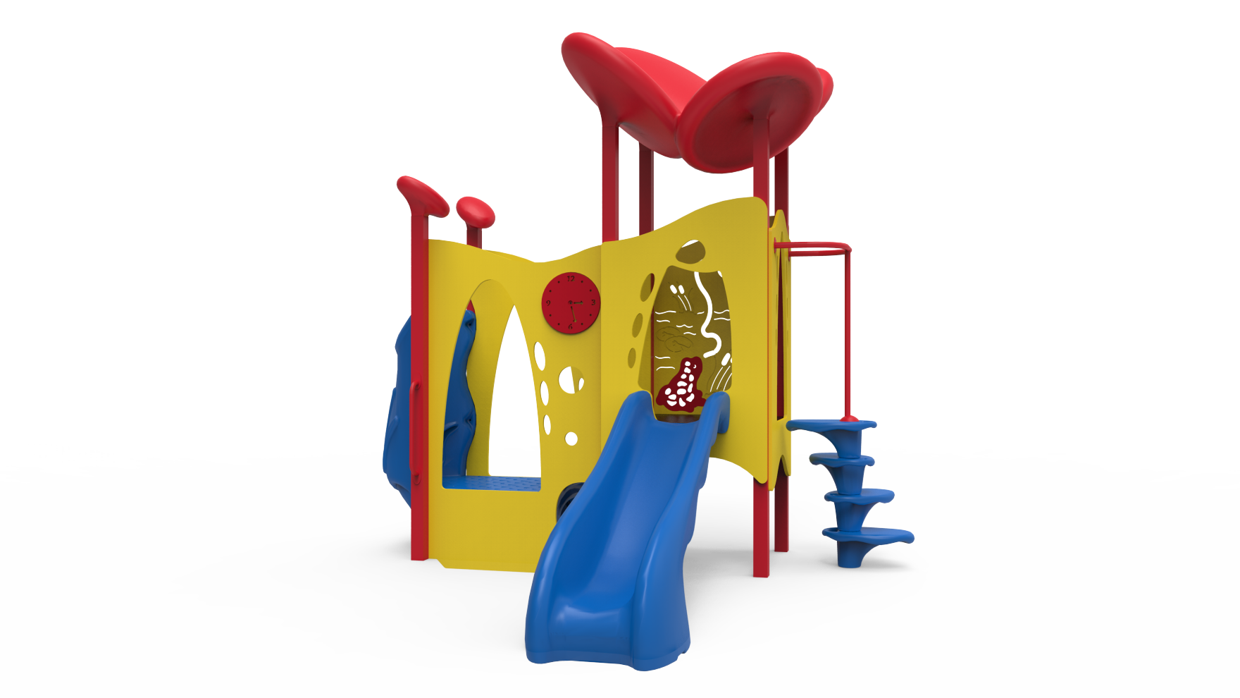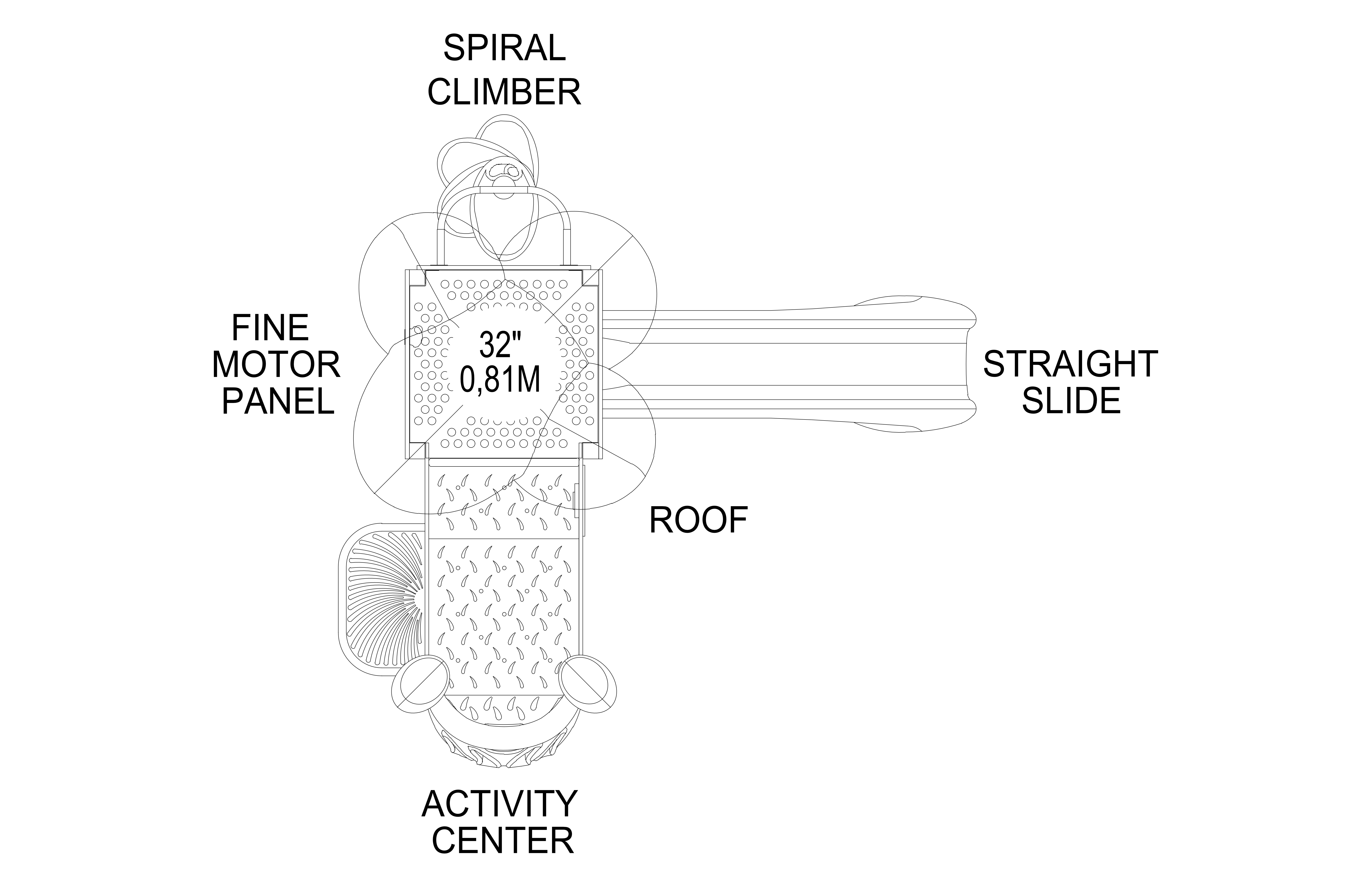 Design #2 encourages pretend play, and develops gross motor and balance skills. Every activity focuses on essential physical, social, and intellectual stimulation. Designed for use with 2" surfacing. All Fun Center playgrounds are made of durable steel and plastics. 12" surfacing version also available.