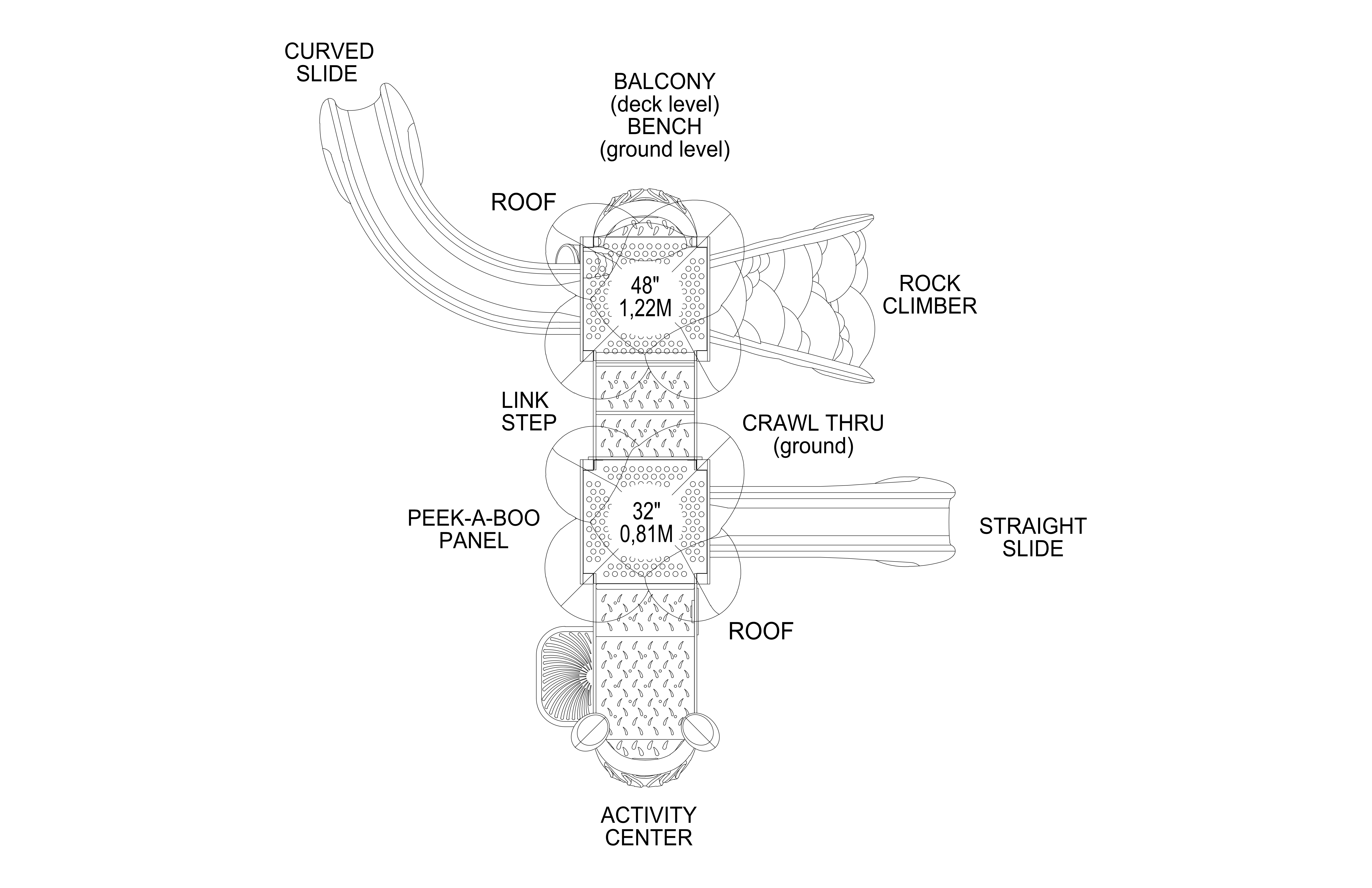 Design #5 develops gross motor and balance skills. Every activity focuses on essential physical, social, and intellectual stimulation. Designed for use with 2" surfacing. All Fun Center playgrounds are made of durable steel and plastics. 12" surfacing version also available.