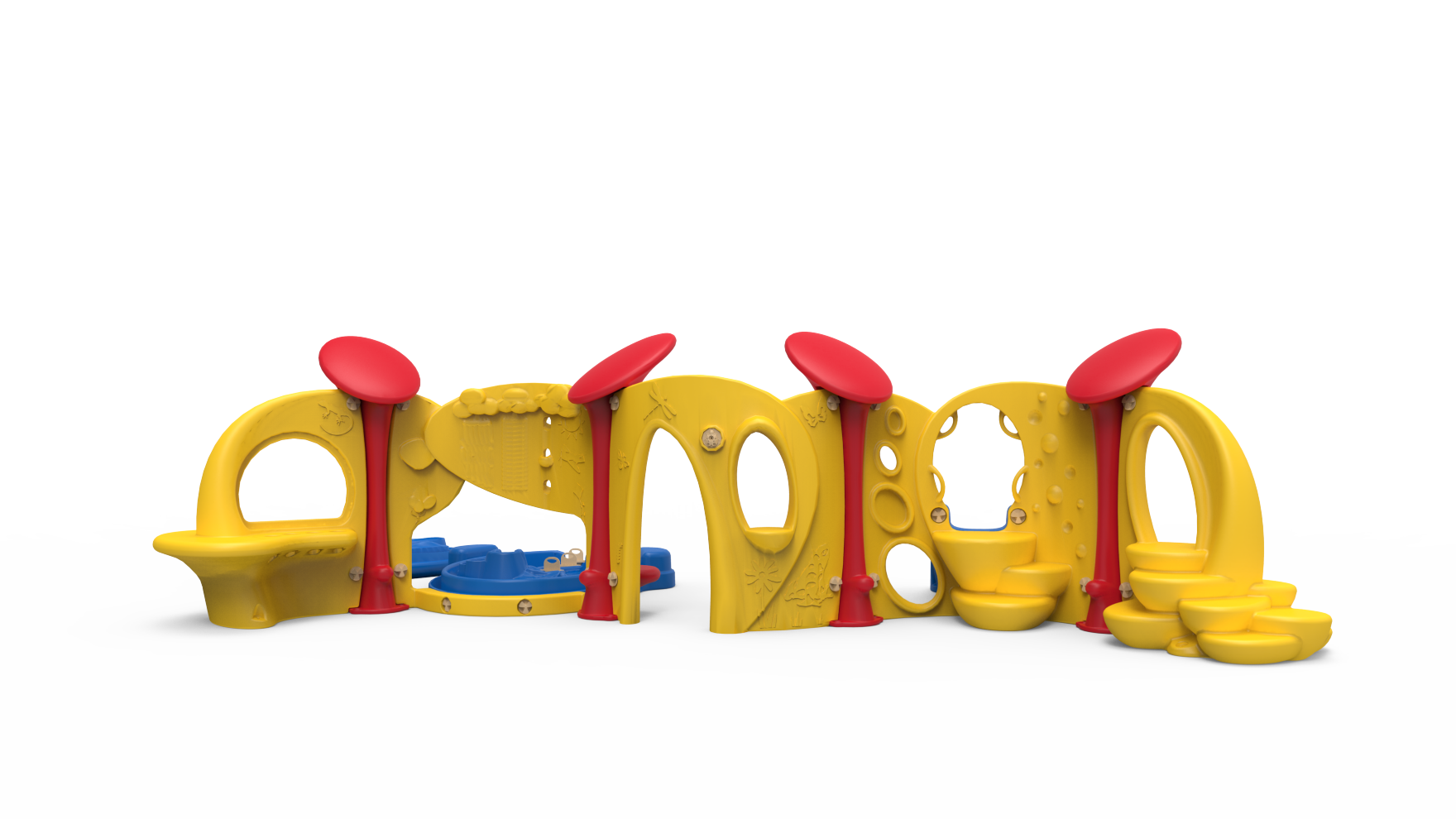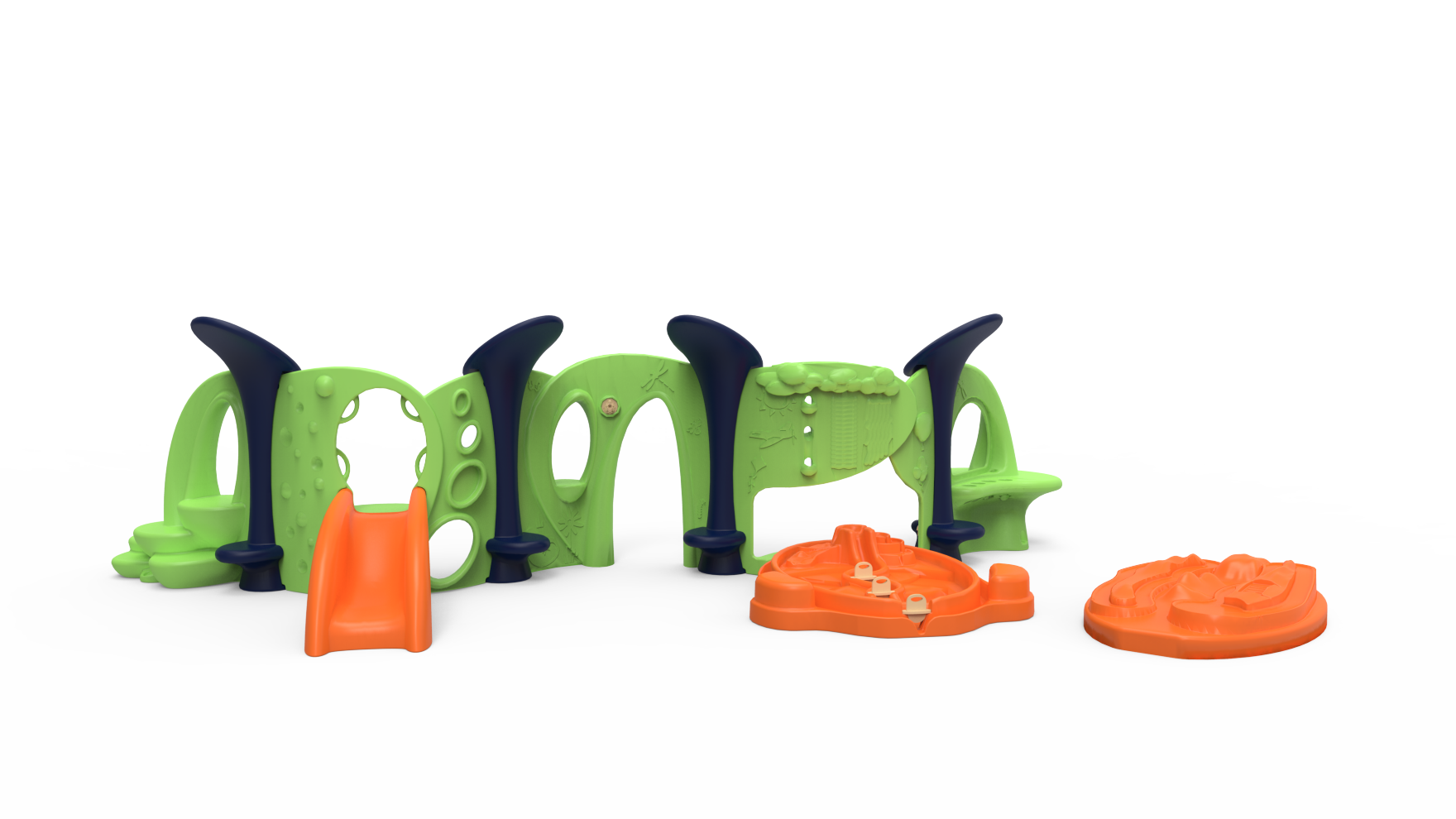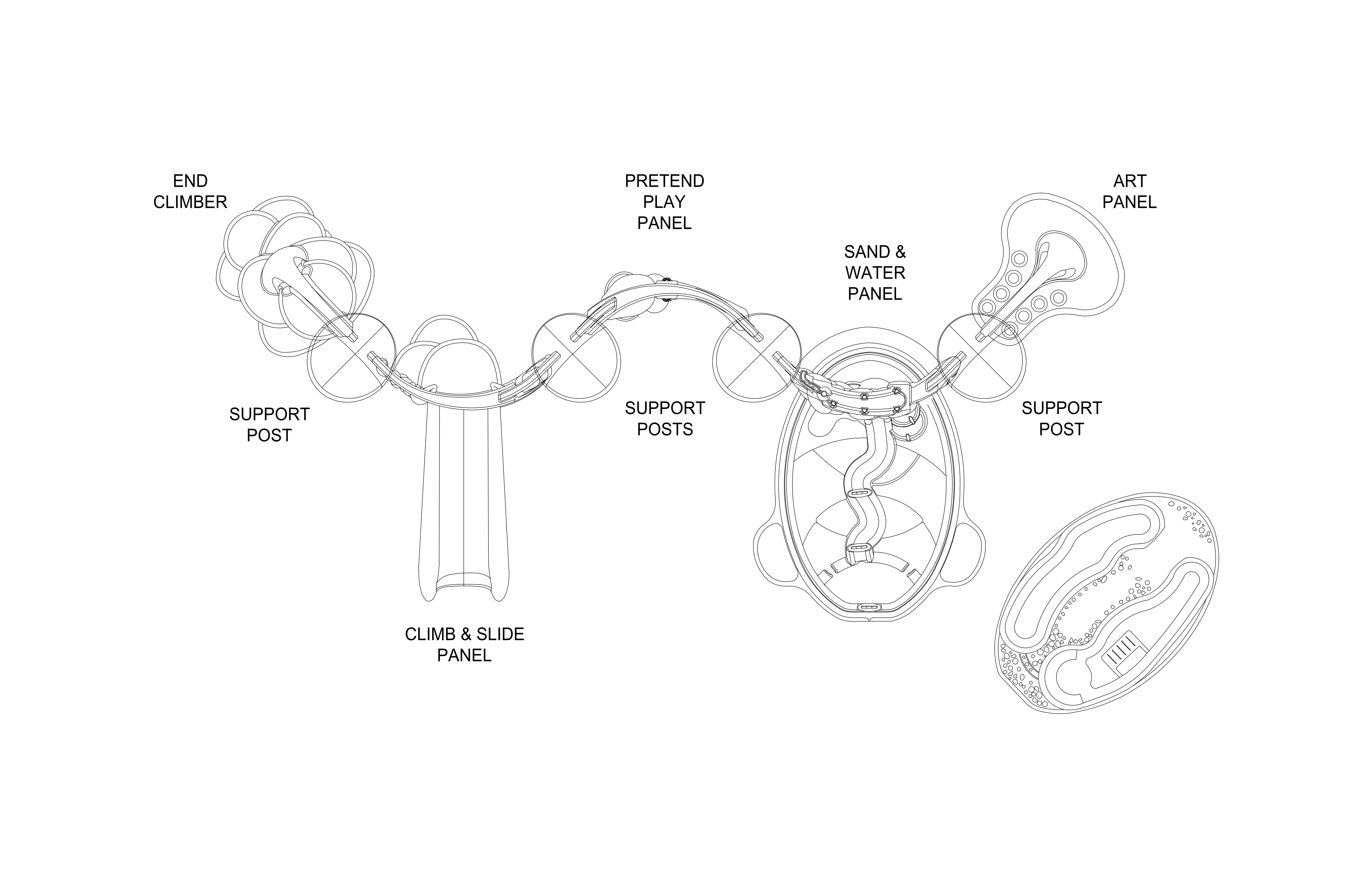 "Design #7 features the Sand & Water Panel, which develops fine motor skills and helps toddlers learn about cause and effect. It also promotes individual, parallel and social play; the Climb & Slide Panel focuses on gross motor skills using climbing, sliding and crawling to encourage repetition; the Pretend Play Panel focuses on imaginative and social play; the Art Panel develops communication, fine motor and decision making skills; the End Climber Panel focuses on gross motor skills, and the steps layout encourages repetition.