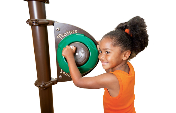 Kids spin the knob to hear their favorite nature sounds, transporting them and their imaginations deep into the forest. Provides an opportunity to teach kids about nature and science (What does the jungle or a windy day sound like?). Supports free play and exploring. Available in full and half panels, and a post version. Part of our full line of fun nature-themed products.