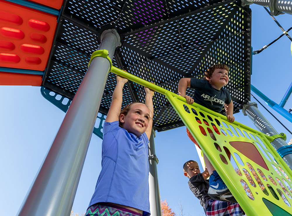 A daring play experience for all ages and abilities, Mighty Descent helps to unite every generation across your community through the distinct rush of sliding. At 8’ tall and featuring an extra-wide bedway, this massive slide is the first of its magnitude that’s not solely a hillside slide, although a hillside version is available. Add cross-generational fun to your play space by connecting Mighty Descent to Challengers, Playmakers, PlayHills, PlayCubes, or&edsp;&edsp;Ropescapes—or incorporate it into your multigenerational design as an independent event.