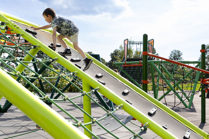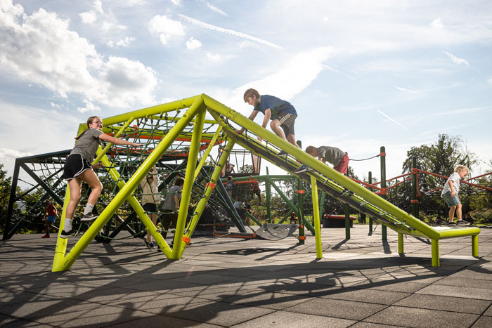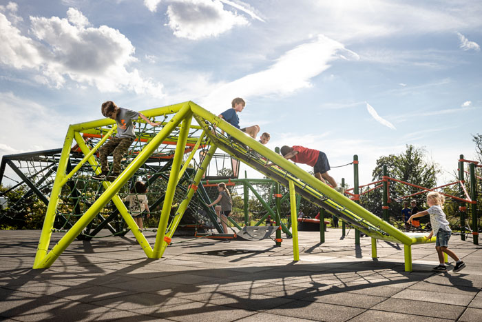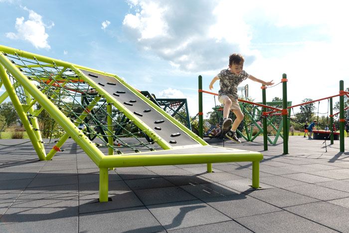 Inspired by Mexico’s Cave of the Crystals, Naica (Ni’ ka) brings the fun of subterranean adventure to the playground’s surface with triangular climbing nets, flextread panels, and even a slide. The flextread panels and climbing nets encourage kids to discover the variety of ways they can explore, while the flat top allows them to feel the traditional excitement that comes from climbing high and sliding back to the ground. Kids will develop their sensory-motor, fine motor, and cognitive skills across Naica’s innovative layouts. 1 ¼” to 5” thick metal tubing and our iconic rope ensure that kids remain safe on their journey, while colorful details offer bold aesthetic appeal.