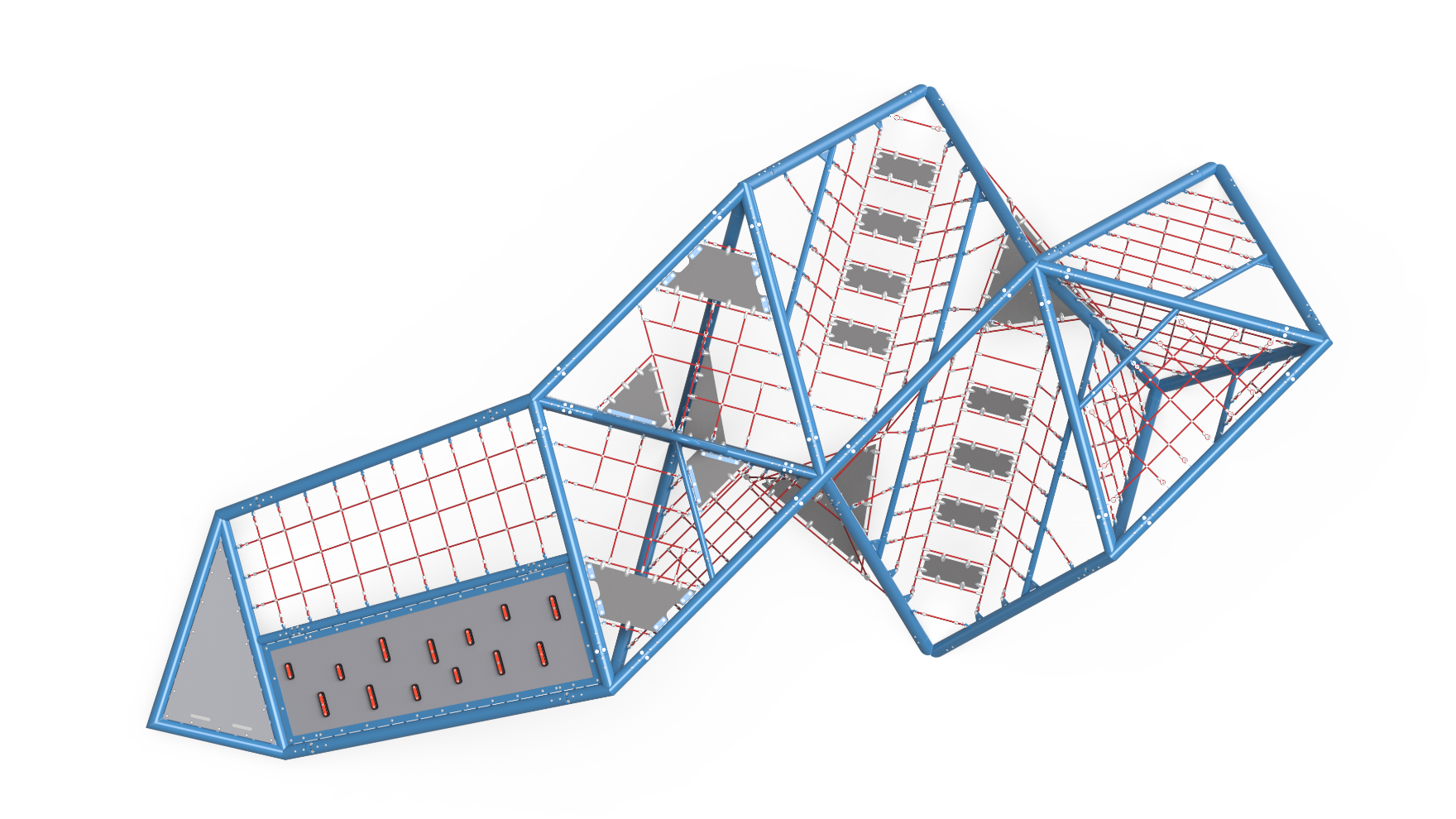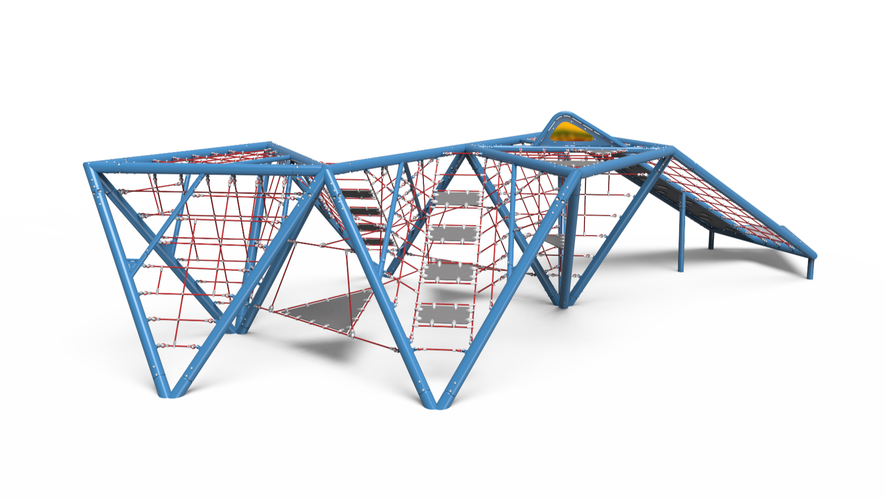 Inspired by Mexico’s Cave of the Crystals, Naica (Ni’ ka) brings the fun of subterranean adventure to the playground’s surface with triangular climbing nets, flextread panels, and even a slide. The flextread panels and climbing nets encourage kids to discover the variety of ways they can explore, while the flat top allows them to feel the traditional excitement that comes from climbing high and sliding back to the ground. Kids will develop their sensory-motor, fine motor, and cognitive skills across Naica’s innovative layouts. 1 ¼” to 5” thick metal tubing and our iconic rope ensure that kids remain safe on their journey, while colorful details offer bold aesthetic appeal.