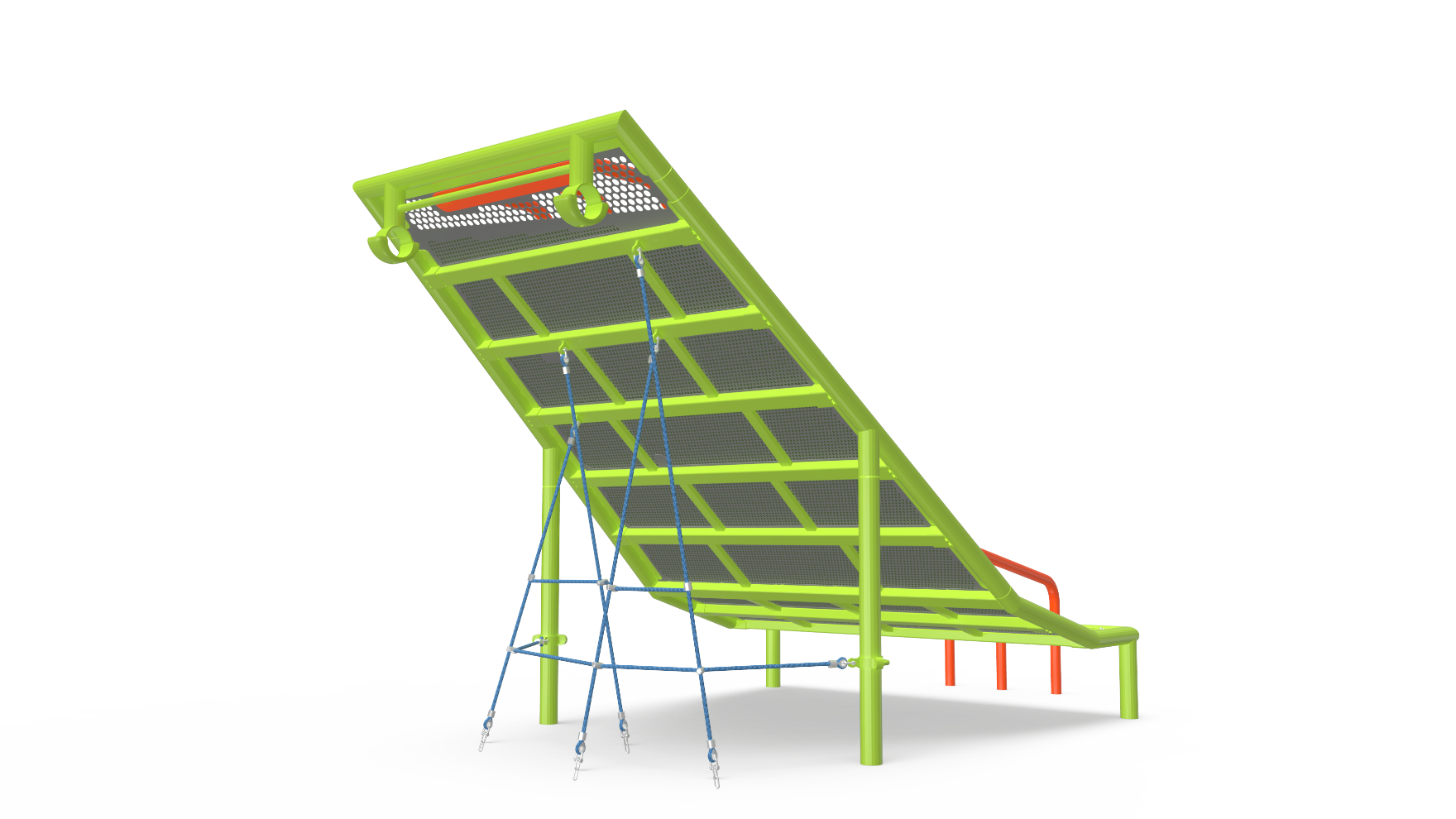 Three steel rails create a daring opportunity for adventurers on Rail Trail, as kids can trek up or back down the hills using them for support. The base of the hill features angled design at transfer-level height, allowing kids of all ability levels to easily mount/dismount the equipment. Climbing ropes are also located beneath the hill to provide ground-level climbing and social play. U.S. Patent Pending