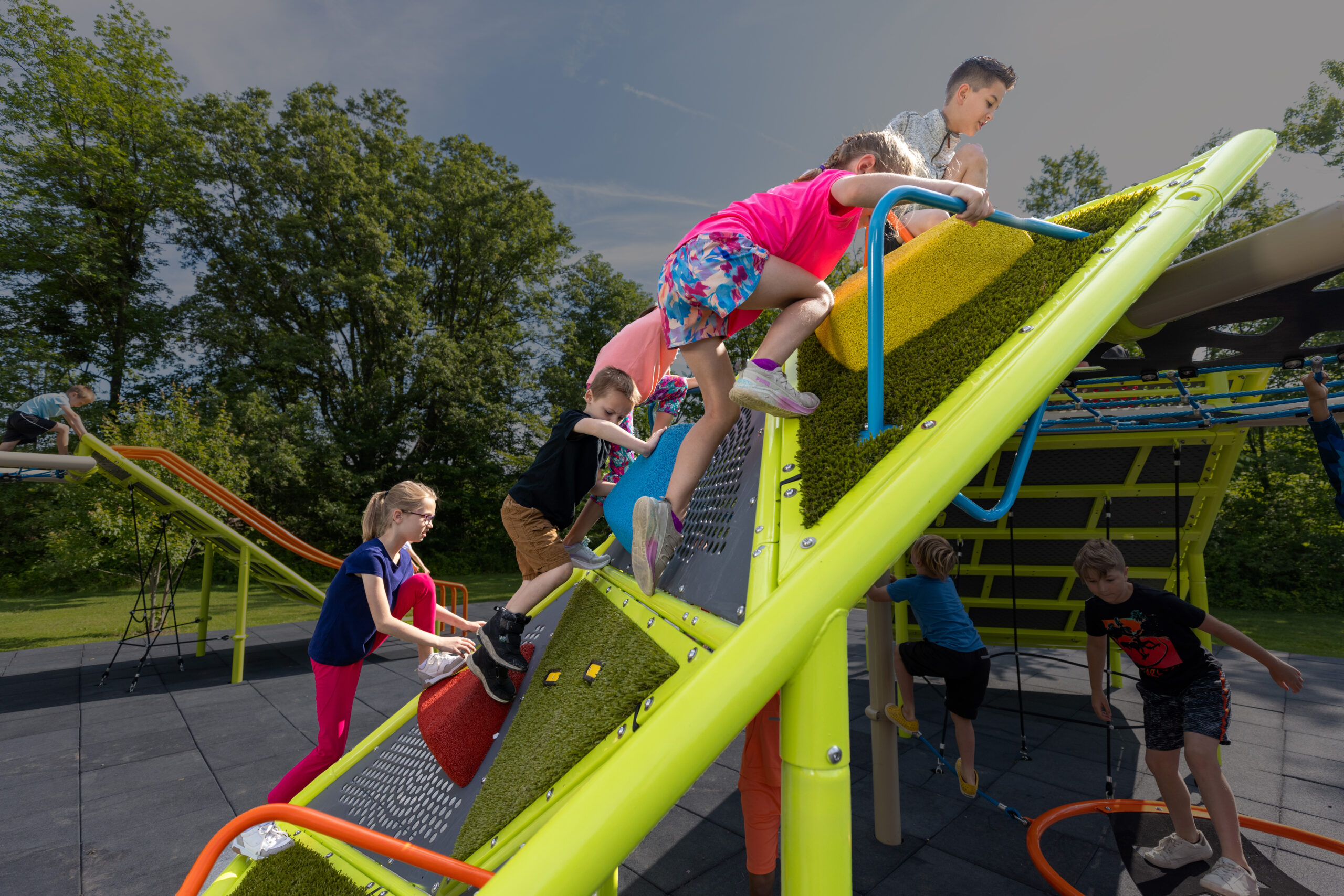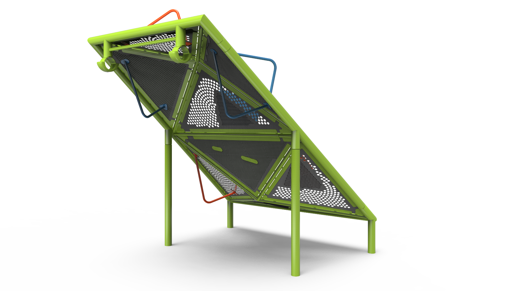 The varied grips of Ridge Trail allow kids to choose the path their play takes. Whether they grab hold of the angular grips or step on a colorful tri-mound, kids will be able to develop their coordination and strength as they scale to the top. Triangular turf and perforated steel panels form the top and bottom halves of this hill, with the top half angling outward like a pyramid and the bottom half angling inward. The base is inclined to a lesser degree, allowing kids to transfer on and off of the equipment. Climbing opportunities are also available at the ground-level, as the underside of the hill features the same angular grips located on the surface.&edsp;&edsp;U.S. Patent Pending