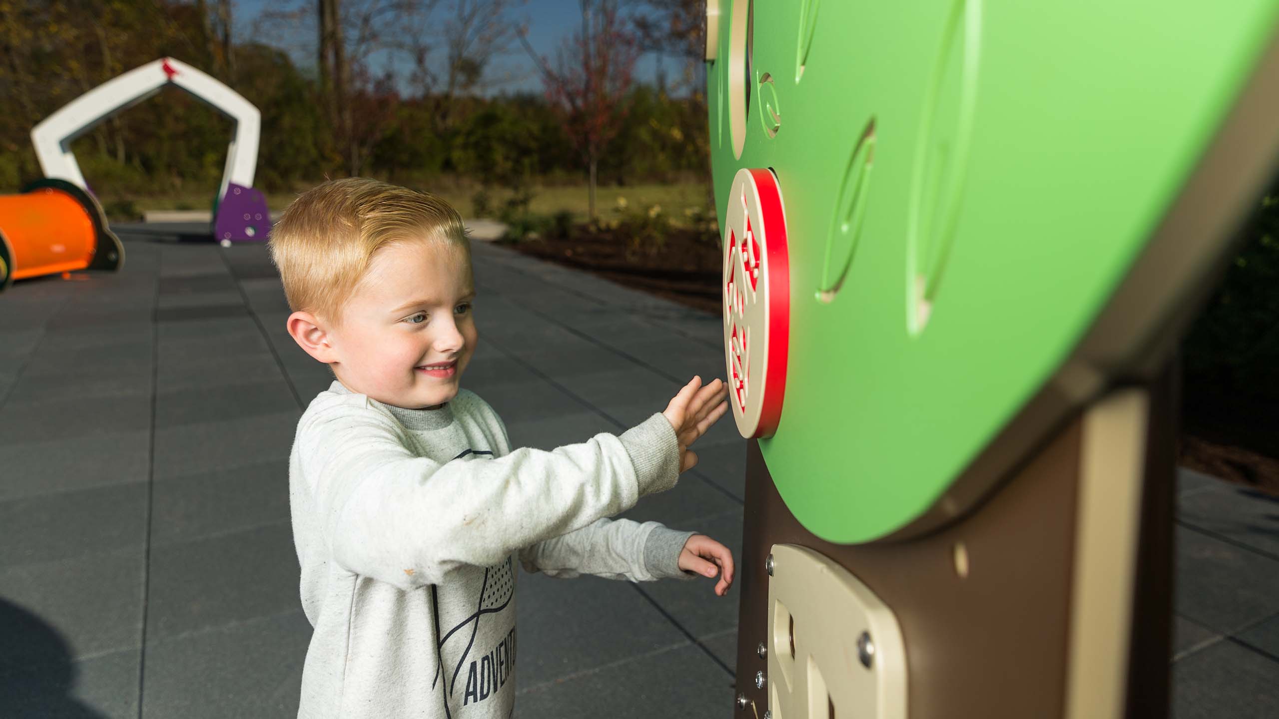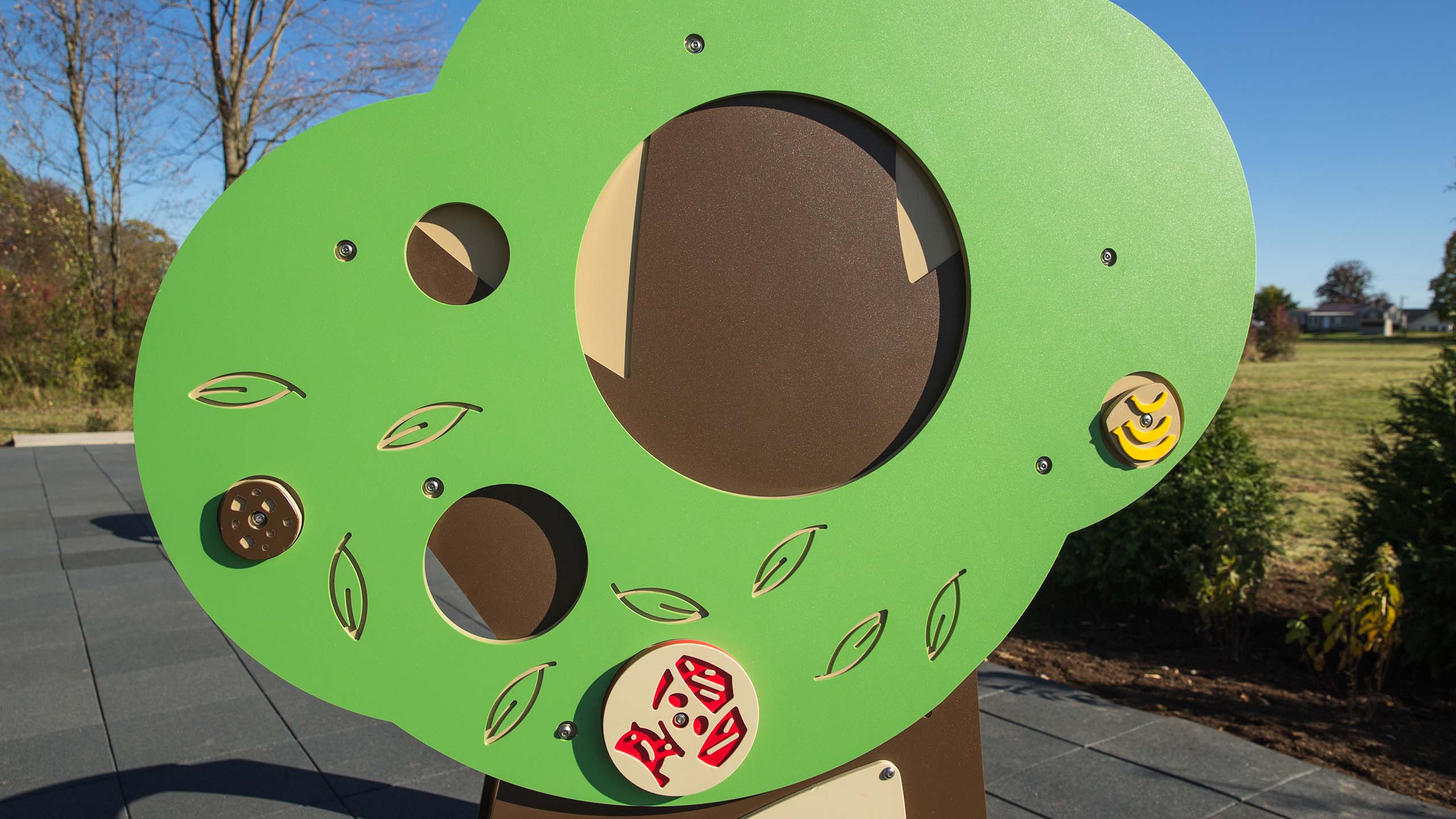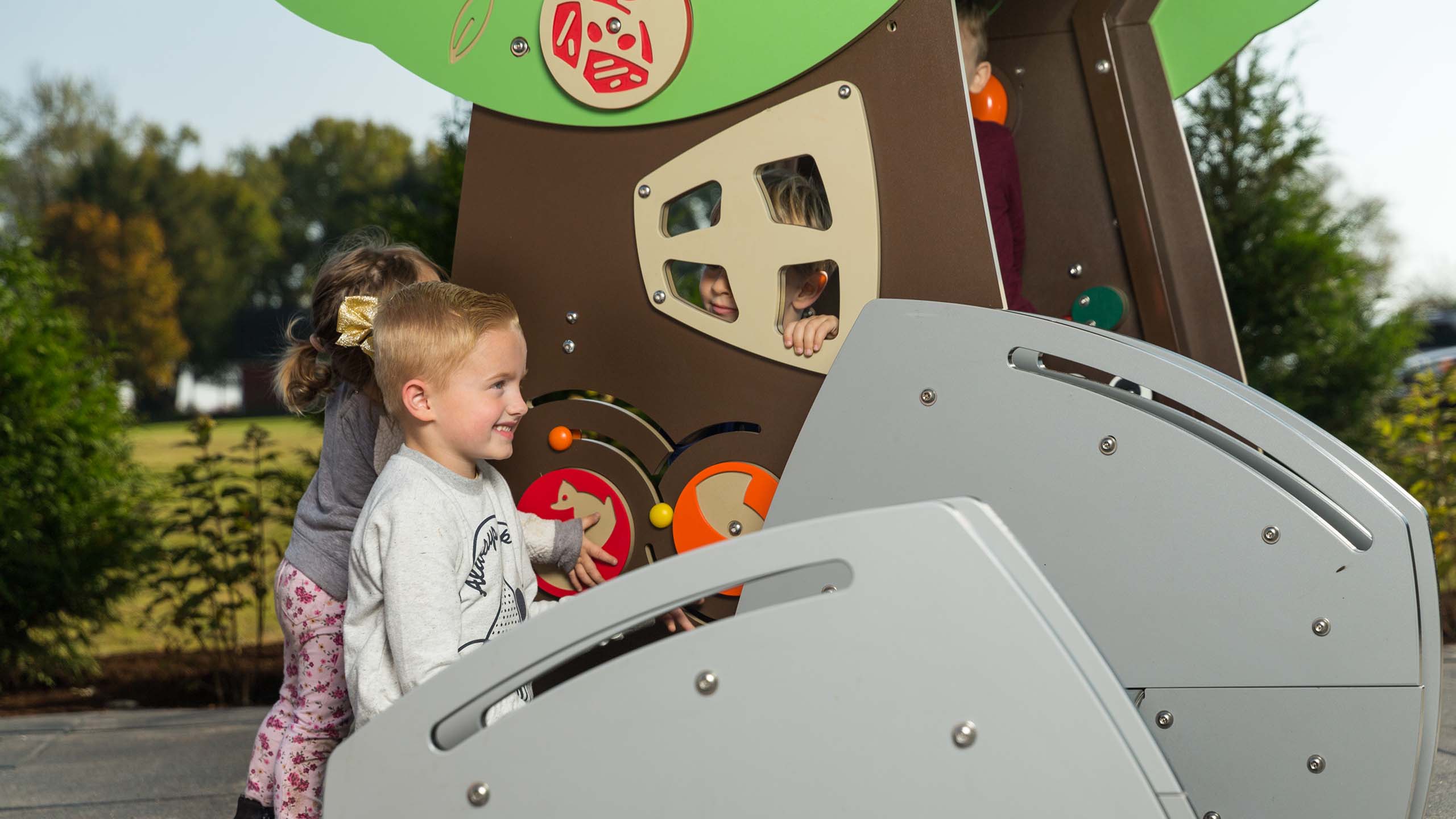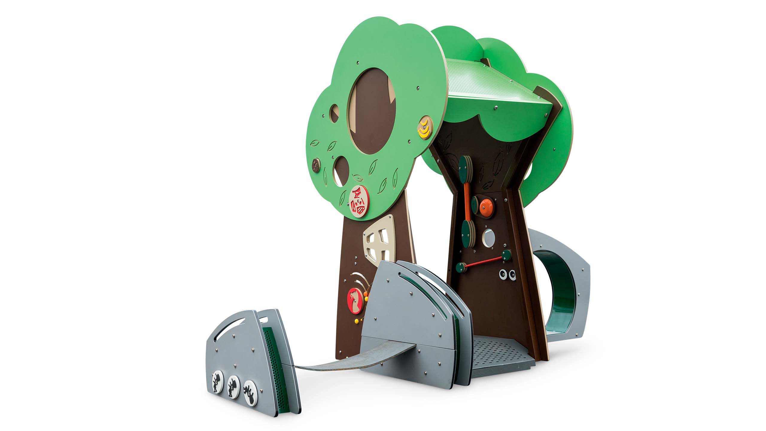 Features engaging, interactive elements and adds a backyard feature to the collection. Silly Tree's design provides important ground-level play that's accessible to everyone. The opening in the tree is designed so a wheelchair user can pass through or a caregiver can be involved in the play. U.S. Patent No. D943700&edsp;