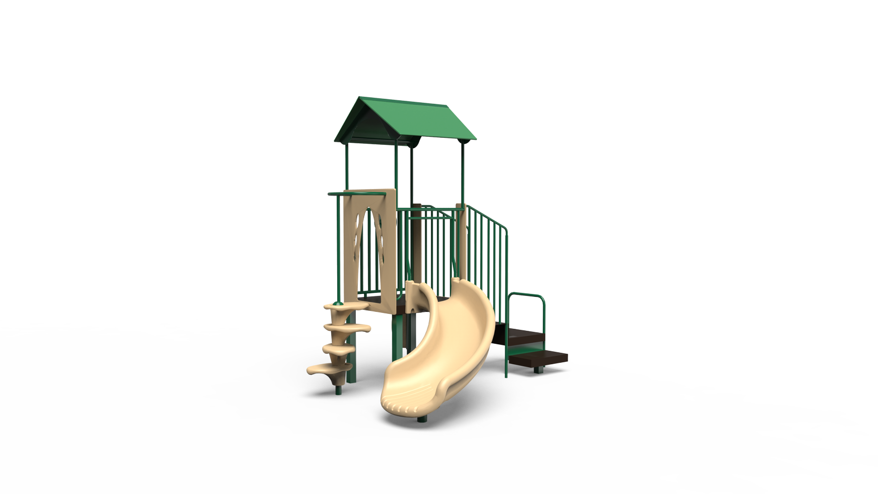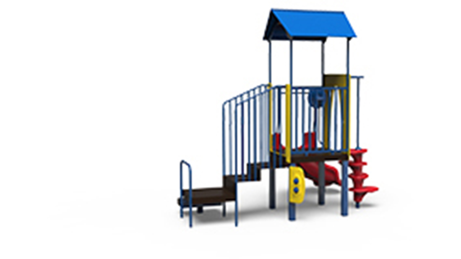 "Simply Play playground may be small, but it's tough! And perfect for daycares, places of worship or any small play area. Transfer Station provides access to children of all abilities while the Spiral Climber provides a more challenging climb to reach the slide. Driver panel promotes pretend play and develops motor skills. Made of durable steel and plastics.