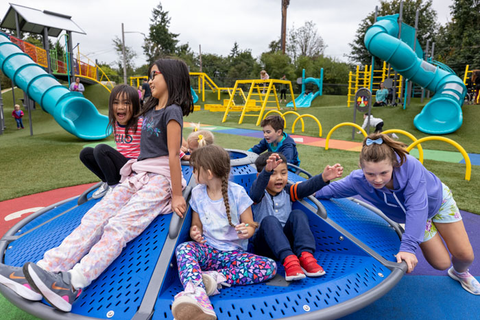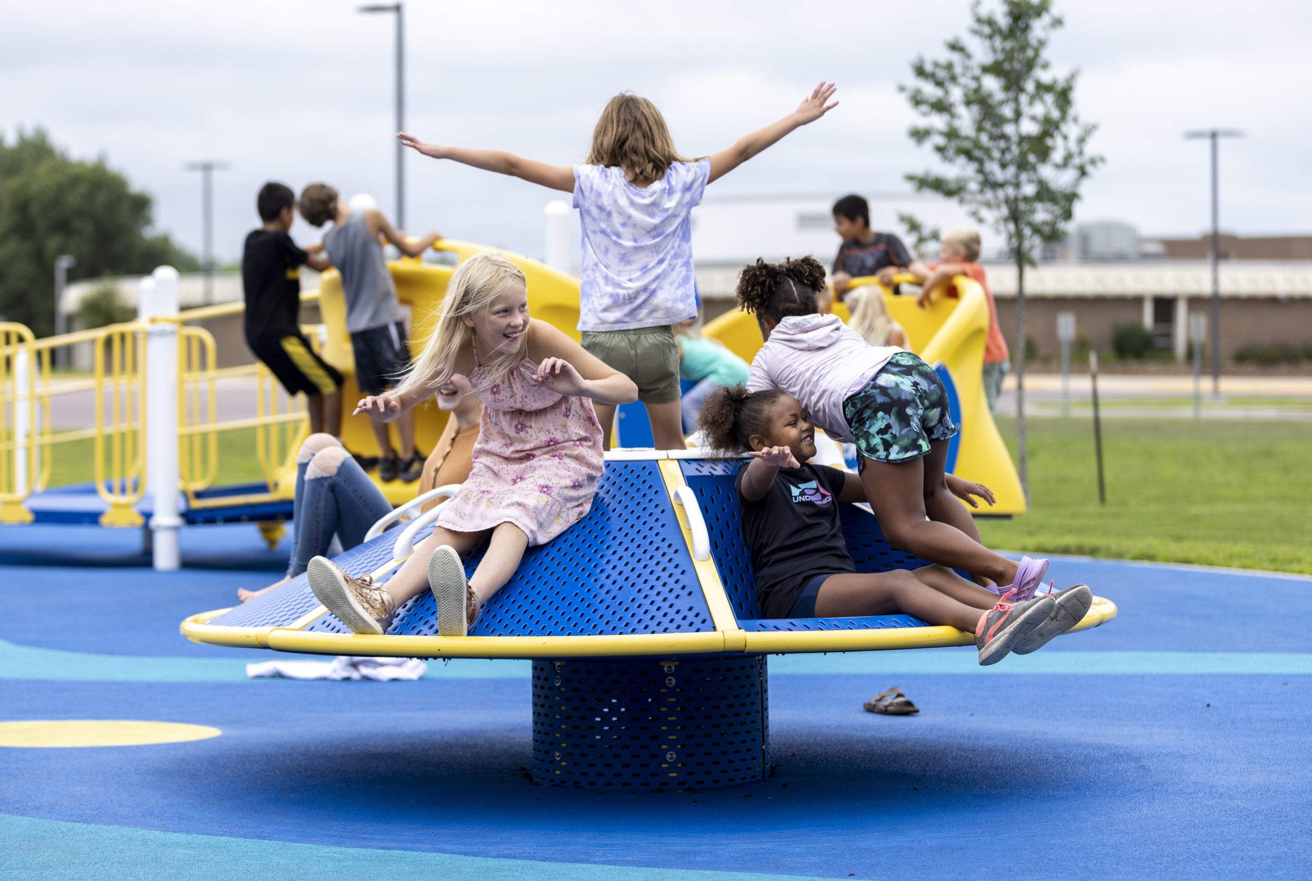 Inclusive whirl with angled sides delivers a unique sensation and physically active experience — climb, spin, stand, sit, lay, hang or balance. Available with or without 1 or 2 recessed, outward-facing inclusive seats at transfer height with an inward pitch to support children with poor trunk control or without recessed seating. Accommodates many children at once — encouraging cooperation and socialization. Optional top cover also available. (Shown with two inclusive recessed seats.)