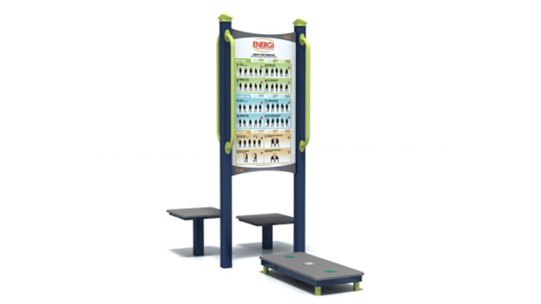 Fourth of five ENERGI stations, features 24 exercises including step-up, lateral step-up, V-step and A-step. Platforms have a textured, non-slip surface for safety. Shown in a surface mount version. Also available in an in-ground mount option.