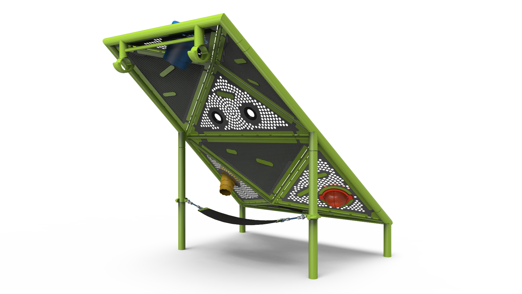 Both climbing and sensory activities engage kids as they climb to the top of Tempo Trail. Hand and footholds are located across the hill to help kids climb, while sensory drums and an auditory sphere provide sensory experiences along the way. Triangular turf and perforated steel panels form the top and bottom halves of this hill, with the top half angling outward like a pyramid and the bottom half angling inward. The base of the hill is also inclined to a lesser degree, allowing kids to transfer more easily on and off of the climber. Beneath the hill, an additional auditory sphere and flextread hammock provide opportunities for social and sensory play.&edsp;&edsp;U.S. Patent Pending