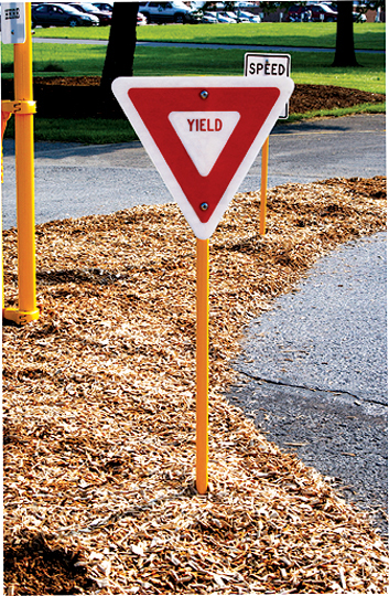 Looks like a real yield sign so toddlers can practice their trike driving skills. Use in combination with our other signs and PlayTown™ Gas Station, Toll Booth, School and House to create a miniature town for trike riders. Also available: Stop Sign, Speed Limit Sign, Accessible Sign, School Zone Sign and Traffic Light. The Yield Sign is made of durable steel and fiberglass.&edsp;